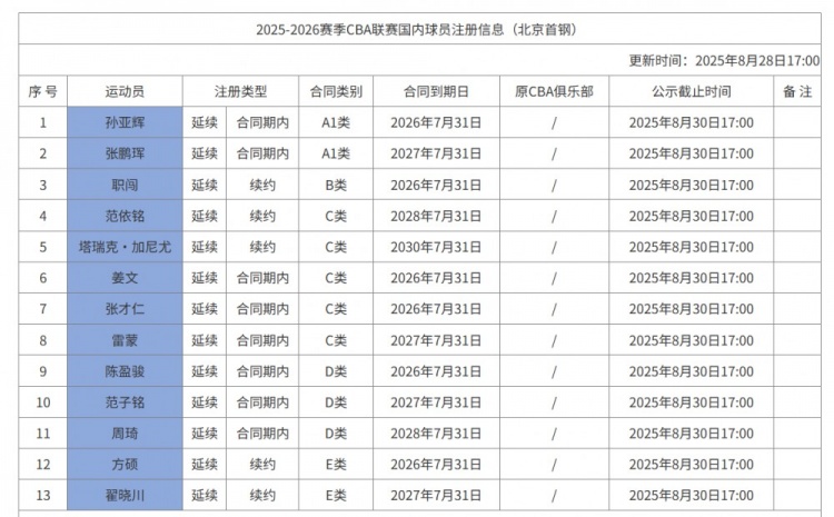 8月28日,CBA官方公布了北京男篮新赛季国内球员的注册名单,共有13名球员完成注册。
