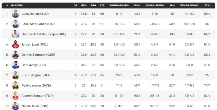本场之前约基奇场均24.3分10板4.7助,本场比赛之后场均数据来到19.8分9.3板4.5助,场均得分从场均24.3分掉到了场均19.8分,从欧锦赛第5名跌至第10名。