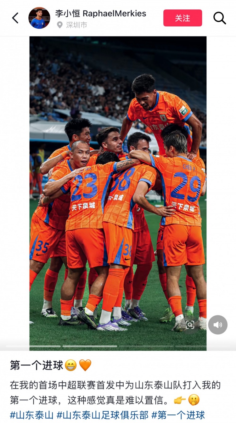 今日李小恒社媒晒照纪念自己中超首球,他为照片配文写道:“在我首次中超首发的比赛就为山东泰山打入我的第一个进球,这种感觉真是难以置信。”